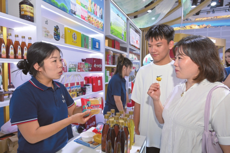 8月21日,忻州展區(qū),市民正在品嘗神池月餅,了解胡麻油制作過程。本報記者申晉光攝