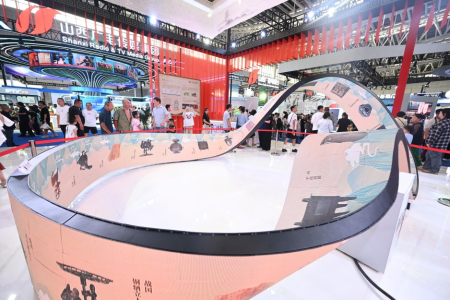 8月22日,山西文博集團展區(qū),游客被莫比烏斯環(huán)柔性屏上展示的珍貴文物吸引。本報記者楊晨玉攝