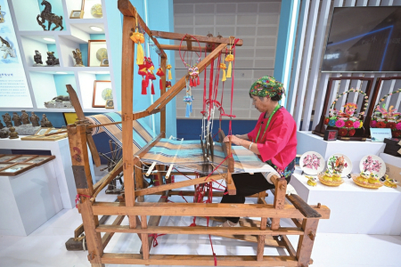 8月21日,運城展區(qū),工作人員展示老粗布制作過程。本報記者阮洋攝