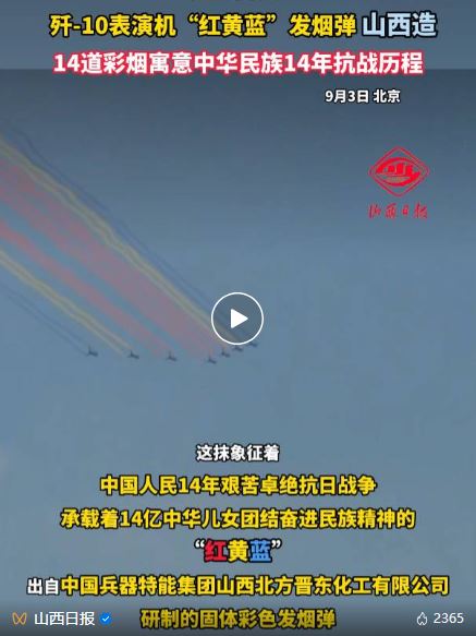 閱兵式上,10時25分左右,殲-10表演機(jī)從天空呼嘯而過,留下14條絢麗奪目的彩煙——這抹象征著中國人民14年艱苦卓絕抗日戰(zhàn)爭、承載著14億中華兒女團(tuán)結(jié)奮進(jìn)民族精神的“紅黃藍(lán)”,出自中國兵器特能集團(tuán)山西北方晉東化工有限公司(以下簡稱“晉東公司”)研制的固體彩色發(fā)煙彈。