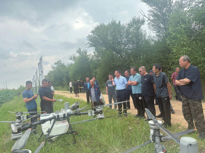 8月18日下午,在朔城區(qū)高升農(nóng)機專業(yè)合作社的試驗田里,一場別開生面的“病蟲害綠色防控田間課堂”正在進(jìn)行——沒有黑板粉筆,取而代之的是嗡嗡作響的無人機、閃著藍(lán)光的太陽能殺蟲燈,還有掛在玉米稈上不起眼的小卡片……來自全區(qū)各鄉(xiāng)鎮(zhèn)的種糧大戶代表、農(nóng)機合作社負(fù)責(zé)人、農(nóng)技人員共計50余人一起觀摩學(xué)習(xí)。