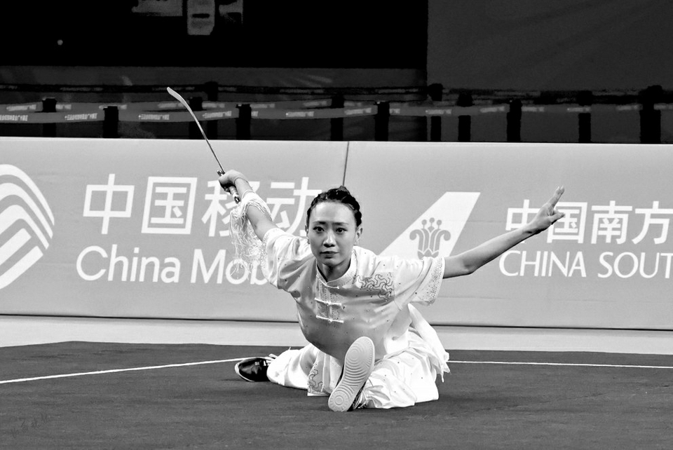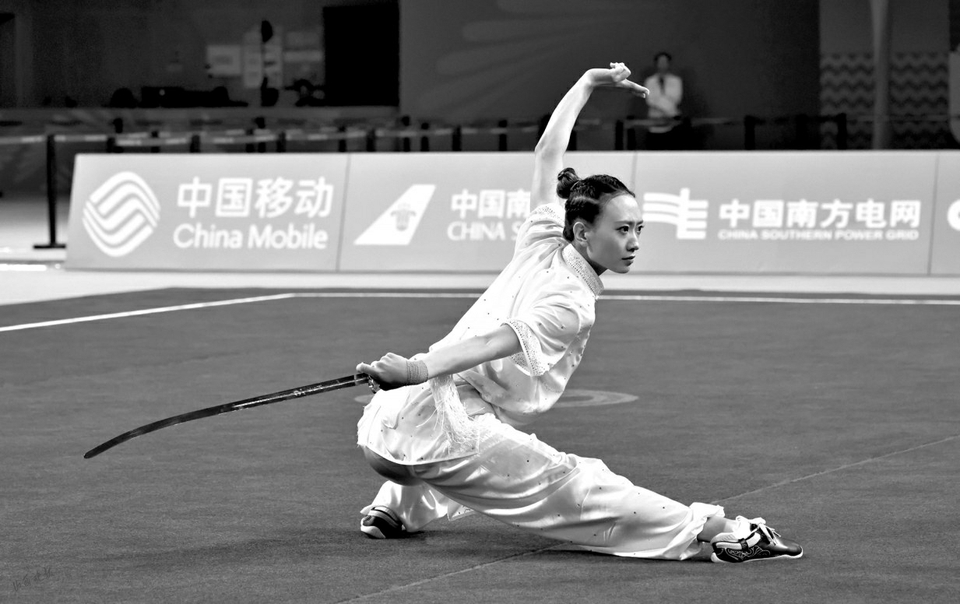 山西隊選手姚洋在武術(shù)套路女子長拳劍術(shù)槍術(shù)全能比賽中。
