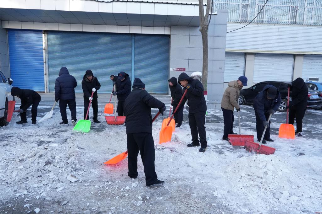 黨員先行,發(fā)揮模范作用。清雪現(xiàn)場,各單位充分發(fā)揮黨組織戰(zhàn)斗堡壘作用和廣大黨員先鋒模范作用,積極參與到所包責(zé)任區(qū)開展掃雪除冰行動,用實際行動踐行“我為群眾辦實事,辦好實事為群眾”的理念。經(jīng)過行人及車輛的踩碾,積雪結(jié)冰又厚又硬給清掃工作帶來了極大困難。干部職工們發(fā)揚不怕苦、不畏難的精神團結(jié)協(xié)作,科學(xué)分組、分片包干、先敲后鏟……大家揮舞著手中的工具,鏟的鏟、掃的掃、推的推,各種清掃工具輪番上陣,呈現(xiàn)出誓將“雪”戰(zhàn)進行到底局面。