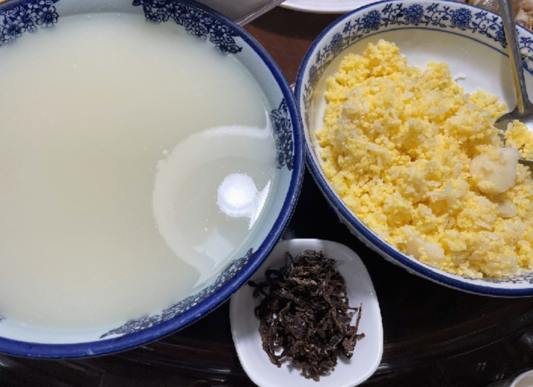 當(dāng)初的驚喜已變成精心的制作 這種酸飯的味道 既不是山西老陳醋的酸 更不是餿了壞了的酸 而是天然的發(fā)酵品 人們用心制成酸湯將糜米放入 在15攝氏度以上浸泡4至8小時(shí)后 澄出糜米即可做成酸粥和酸撈飯 ▼ (酸撈飯)