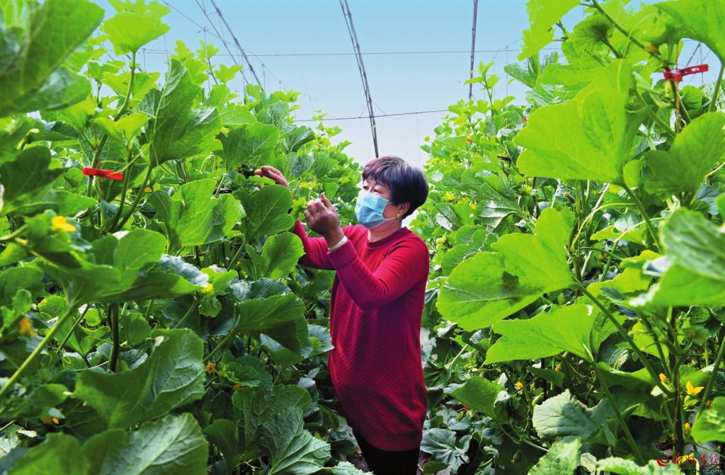 農(nóng)戶對溫室大棚內(nèi)的甜瓜進行打掐枝葉