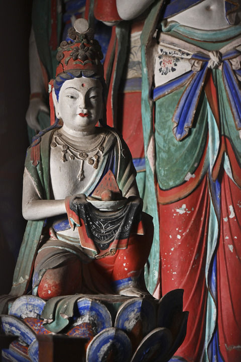 進(jìn)入東大殿內(nèi),迎面是30余尊唐代彩塑。整組塑像以釋迦牟尼為中心,脅侍菩薩、供養(yǎng)菩薩、護(hù)法金剛、隨從者姿勢(shì)不同,服飾各異,表情豐富,呈現(xiàn)出佛祖說法的宏闊壯觀場(chǎng)面。