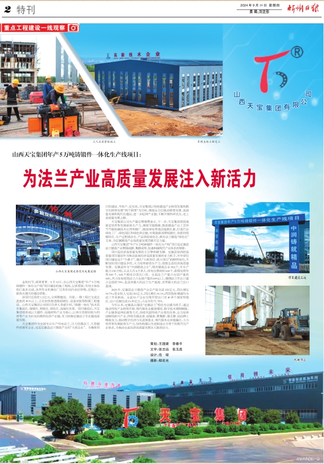 天寶集團(tuán)作為全國專業(yè)生產(chǎn)風(fēng)電法蘭、壓力容器法蘭、大型鍛件的領(lǐng)軍企業(yè),也是定襄縣法蘭鍛造產(chǎn)業(yè)的“頭部企業(yè)”。為確保項目快建設(shè)、早投產(chǎn)、見實效,天寶集團(tuán)以傳統(tǒng)鍛造產(chǎn)業(yè)轉(zhuǎn)型發(fā)展和數(shù)字化轉(zhuǎn)型發(fā)展“兩個轉(zhuǎn)型”為目標(biāo),圍繞全方位推動轉(zhuǎn)型發(fā)展、高質(zhì)量發(fā)展和現(xiàn)代化建設(shè),進(jìn)一步延伸產(chǎn)業(yè)鏈,不斷開展科研攻關(guān),走上高質(zhì)量發(fā)展之路。