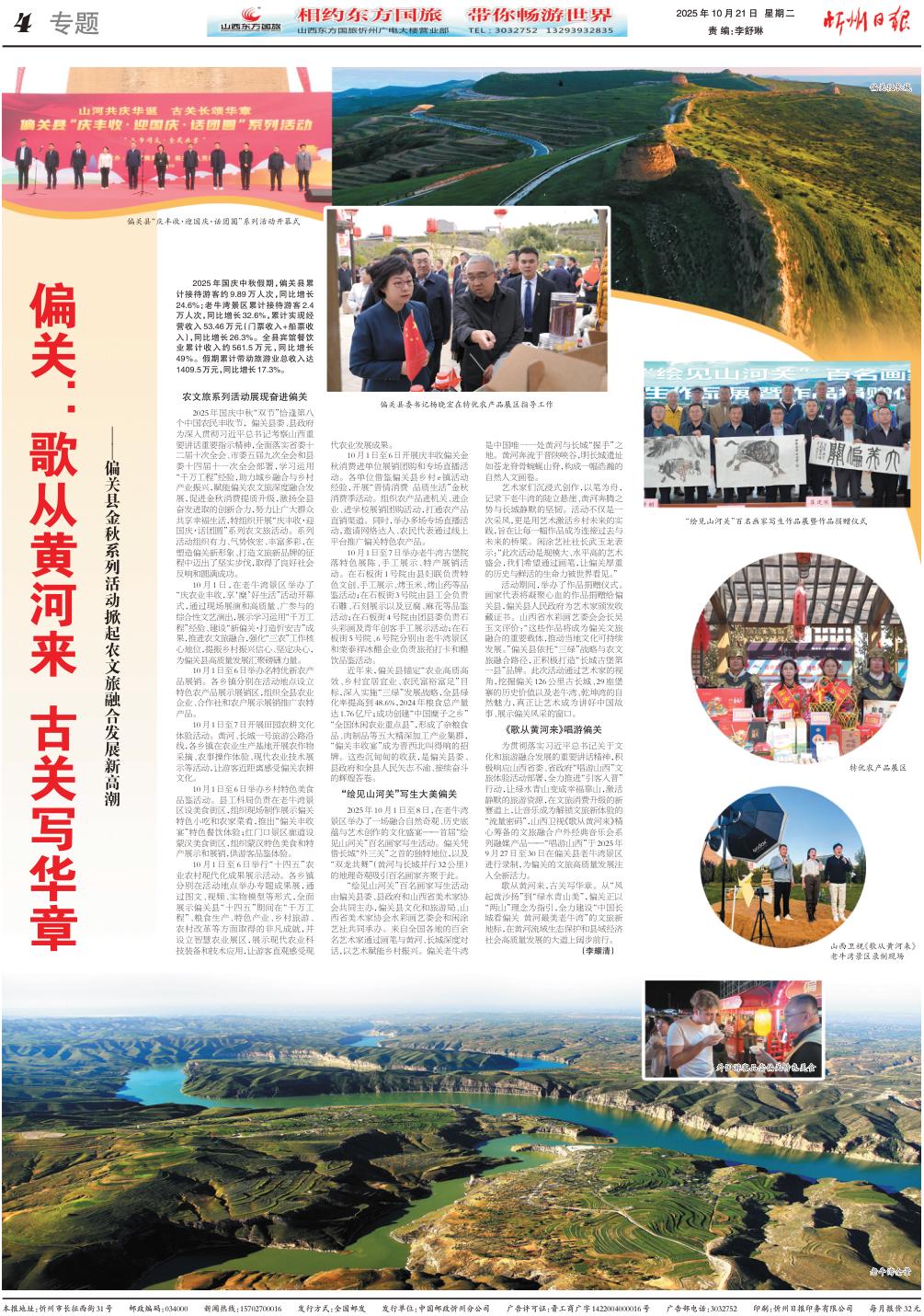 2025年國慶中秋“雙節(jié)”恰逢第八個(gè)中國農(nóng)民豐收節(jié),偏關(guān)縣委、縣政府為深入貫徹習(xí)近平總書記考察山西重要講話重要指示精神,全面落實(shí)省委十二屆十次全會、市委五屆九次全會和縣委十四屆十一次全會部署,學(xué)習(xí)運(yùn)用“千萬工程”經(jīng)驗(yàn),助力城鄉(xiāng)融合與鄉(xiāng)村產(chǎn)業(yè)振興,賦能偏關(guān)農(nóng)文旅深度融合發(fā)展,促進(jìn)金秋消費(fèi)提質(zhì)升級,激揚(yáng)全縣奮發(fā)進(jìn)取的創(chuàng)新合力,努力讓廣大群眾共享幸福生活,特組織開展“慶豐收·迎國慶·話團(tuán)圓”系列農(nóng)文旅活動。系列活動組織有力、氣勢恢宏、豐富多彩,在塑造偏關(guān)新形象、打造文旅新品牌的征程中邁出了堅(jiān)實(shí)步伐,取得了良好社會反響和圓滿成功。