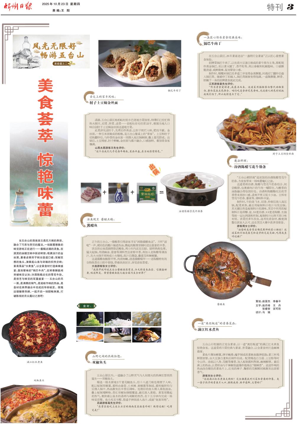 當五臺山的清泉流云遇見川湘的奔放、融合了巧思與烹飪的魔法,一場顛覆想象的味覺游戲正在進行——醬醋點睛的活魚,在滾燙的油醋交響中躍動鮮甜;吸滿湯汁的金絲面,裹著鹵香肘子燜出勁道口感;雙椒狂想的魚頭,演奏起山泉與剁椒的熾熱交響;素齋菜品“水煮魚”,以全素食材打造麻辣盛宴;復刻葷味的“鍋巴牛肉”,在鮮香酥脆間突破味覺認知;汾酒陳醋點化的雪花牛肋,是技藝與味覺的雙重盛宴……五臺山的另一面,是沸騰的鍋氣,是滋啦作響的熱油,是食材在跨界融合中完成的華麗蛻變。跟隨這縷酸香熱辣,一起開啟一場酣暢淋漓、打破陳規(guī)的舌尖魔幻之旅吧!