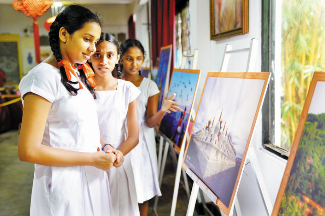 9月29日,在斯里蘭卡首都科倫坡的總統(tǒng)女子學校小禮堂,學生們觀看展出的中國四川風光攝影作品。新華社記者 唐 璐 攝