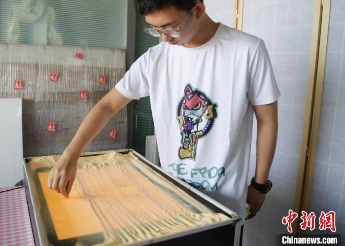 “比方說(看)油畫、國(guó)畫之類的,然后我們進(jìn)行二次創(chuàng)作,繪制出小稿,最后去繪制沙畫?!彪拷榻B,自6月中旬著手設(shè)計(jì)以來,自己每天都要在一個(gè)悶熱的“小黑屋”里待上幾個(gè)小時(shí),創(chuàng)作過程總計(jì)花費(fèi)近80個(gè)小時(shí)。