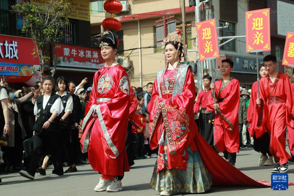 4月29日,漢服愛(ài)好者在葉縣葉公古街巡游表演。