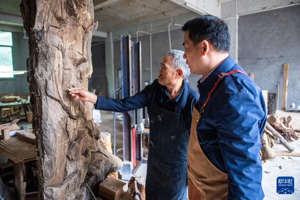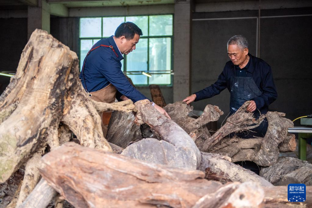 5月23日,在洞口縣巖山鎮(zhèn)陽(yáng)家山村,傅立先(左)和父親傅金林在挑選木雕材料。