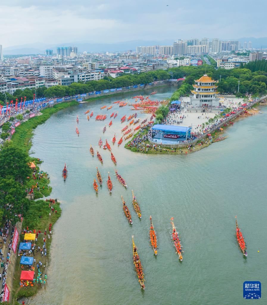 端午節(jié)臨近,湖南道縣舉行非遺龍船賽,眾多龍船在瀟水河上競渡,迎接佳節(jié)到來。新華社發(fā)(蔣克青 攝)