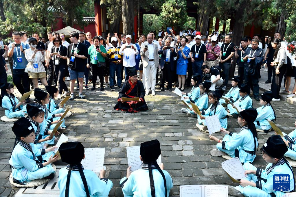 6月27日,在曲阜孔廟,嘉賓和游客在聆聽孩子們誦讀《論語》。
