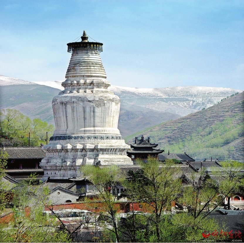 大白塔全名釋迦文佛真身舍利寶塔。該塔在元大德五年(公元1302年)由尼泊爾匠師阿尼歌設(shè)計建造,塔身用石頭砌成。地上部分高度為56.37米,比北京北海大白塔高20.4米,故有“清涼第一圣境”的美譽(yù)。大白塔之東,一進(jìn)三院。前院為都綱院,中院為錢糧庫,后院為方丈院。