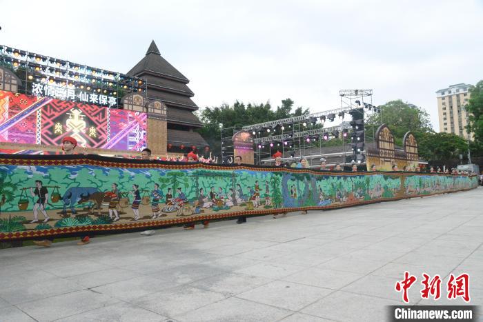 4月11日,2024年海南黎族苗族傳統(tǒng)節(jié)日“三月三”節(jié)慶活動(dòng)主會(huì)場(chǎng)開(kāi)幕式暨文藝演出在保亭黎族苗族自治縣舉行。圖為黎族民俗風(fēng)情黎錦長(zhǎng)卷展示。張?jiān)潞?攝