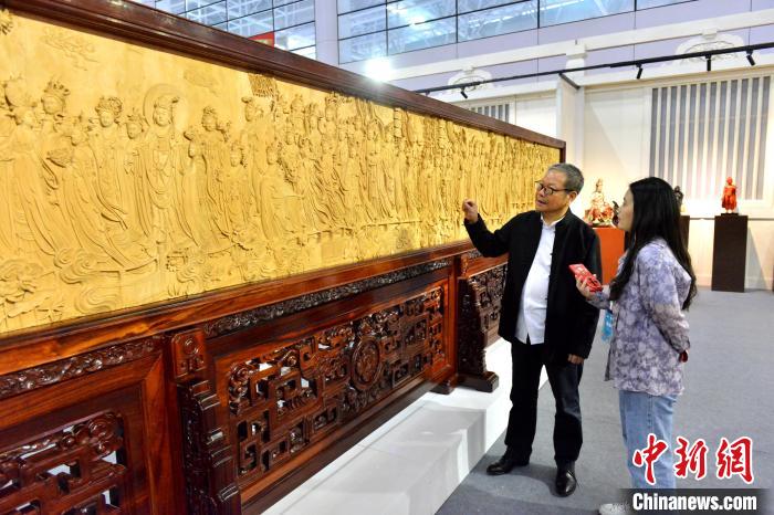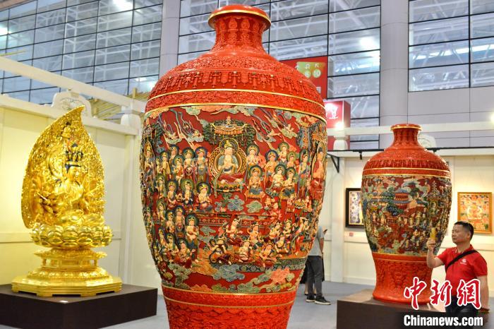 5月9日,第四屆中國(guó)工藝美術(shù)博覽會(huì)在福建福州啟幕,圖為雕漆作品《凈土文化對(duì)瓶》吸引觀展者目光。 中新網(wǎng)記者 呂明 攝