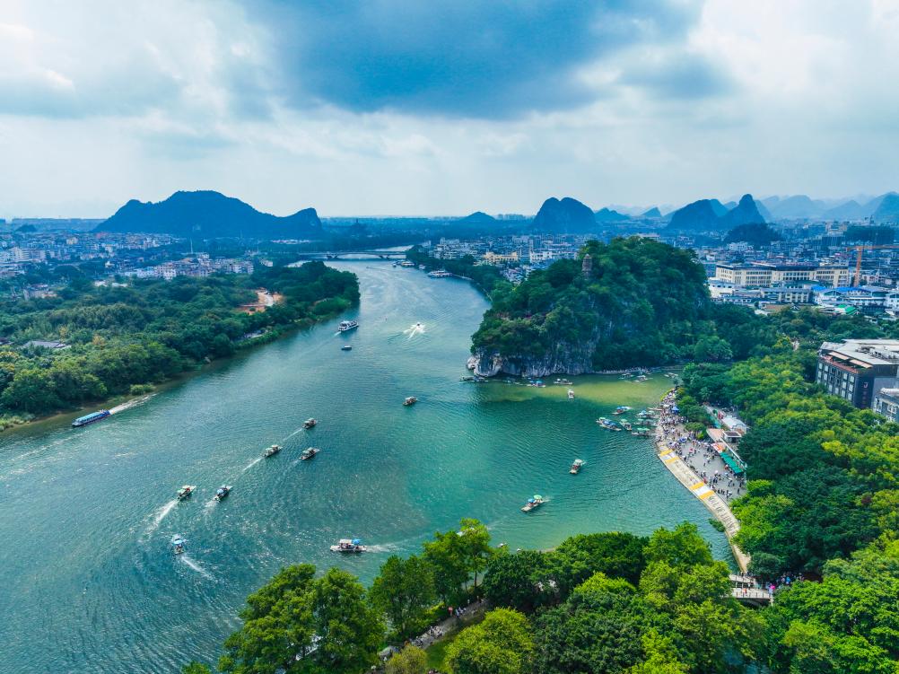 在桂林象鼻山景區(qū)一帶,游客乘船游覽漓江(無(wú)人機(jī)照片)。新華社發(fā)(劉崢 攝)