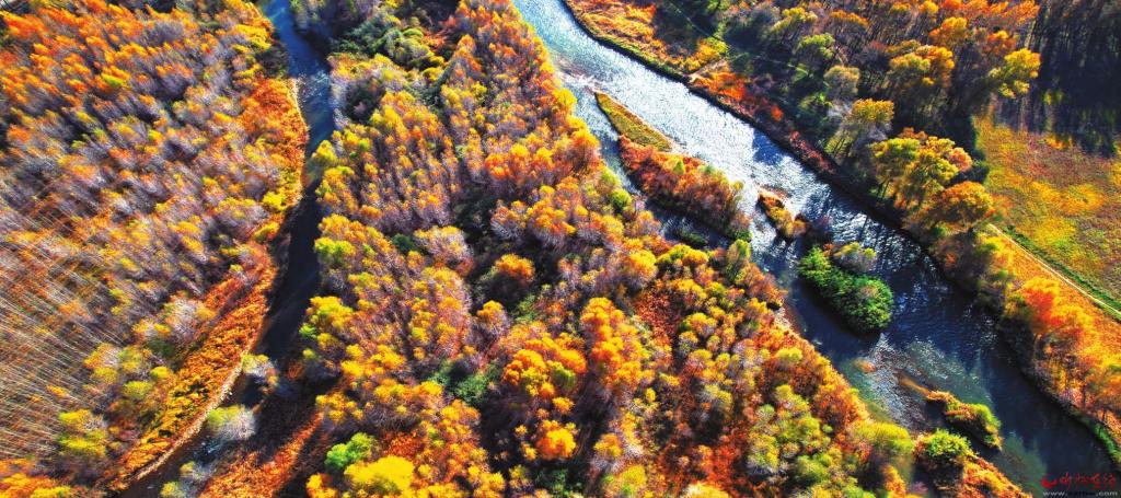 汾河兩岸景色美。圖為記者近日航拍的靜樂汾河川國家濕地公園秋景。(