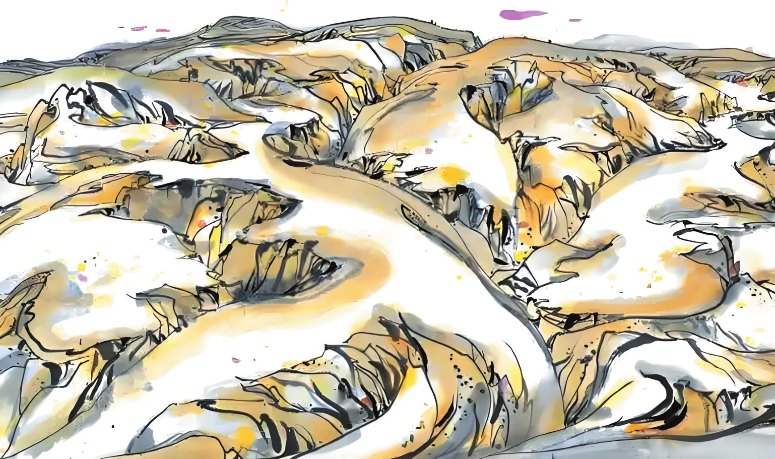 1989年10月的河曲寫(xiě)生,是吳冠中藝術(shù)生涯的重要轉(zhuǎn)折點(diǎn)。在陪同的學(xué)生王秦生引導(dǎo)下,這位古稀老人尋找“黃土荒漠之典型地區(qū)”,最終駐足晉西北河曲縣。每日晨起,他面對(duì)被雨水沖刷、滿山皆溝壑的地貌,靜心思考,猛然產(chǎn)生了驚人的藝術(shù)聯(lián)想——起伏的山形如同眾多老虎,而那些溝壑恰似老虎皮毛上的斑紋。他在《出現(xiàn)老虎》一文中寫(xiě)道:“我終于發(fā)現(xiàn)黃土高原是展拓了的老虎之群,其間伏臥著無(wú)數(shù)猛虎,有的正將躍起,有的還在酣睡。作完數(shù)幅黃土高原,意猶未盡,于是我畫(huà)起老虎來(lái)?!边@種將地理特征轉(zhuǎn)化為藝術(shù)創(chuàng)作標(biāo)志著吳冠中完成“從風(fēng)景寫(xiě)生到精神寫(xiě)意”的蛻變,其價(jià)值在于為現(xiàn)代中國(guó)畫(huà)開(kāi)辟了根植本土、融貫中西的新路徑。一個(gè)月河曲翠峰山寫(xiě)生之旅誕生的《老虎高原》,更以極富樂(lè)感的線條勾勒出這片土地精神的圖騰。