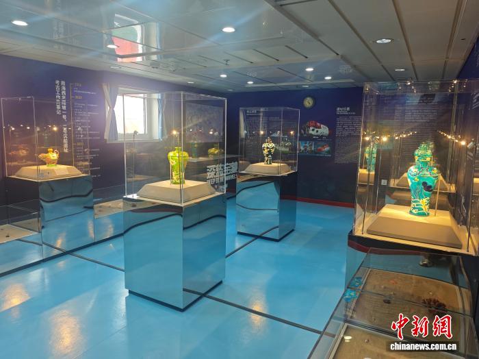 10月13日,全國首家海上流動博物館升級改造落成儀式在三亞舉行。圖為“南海之夢”號郵輪上全新推出的“深藍寶藏——南海西北陸坡一二號沉船考古成果特展”主題展覽。張月和 攝