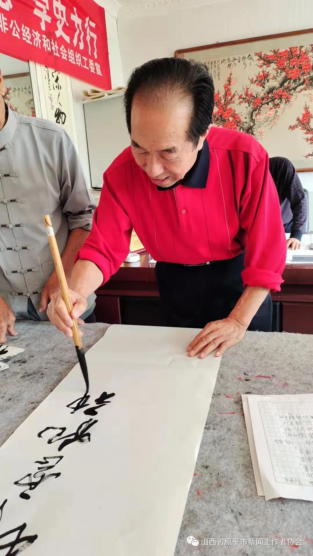 活動現(xiàn)場,大家暢所欲言,紛紛聯(lián)系思想實際,交流了學習黨史、明理知進的心得體會,圍繞學史長知、學史明理、學史增信、學史興業(yè)進行了熱烈討論。接著,書畫藝術(shù)組的書法家亢銀中、趙存仁、王玉伍、張正山、王福歲、王弘新,及學會顧問書畫名家溫樹森老師、以及特邀書畫名家李晉復先生,紛紛揮毫潑墨,書寫出學習黨史的感悟與名言。大筆揮灑中,一幅幅寫有“賡續(xù)精神血脈、傳承紅色基因”“明理增信.崇德力行”“不忘初心、牢記使命”和“江山就是人民、人民就是江山”等字樣的真、草、隸、篆、行書藝作品,從筆下飄然而出。墨香中呈現(xiàn)出各有千秋、韻味感人的風格,博得觀賞者們的點贊稱道,并爭相拿到一幅贈品。書法家們顧不上喝水,整整忙了一個上午。特別是書畫藝術(shù)組組長李文光,由于平時在廣州忙于接送孩子上學,放暑假回原平后特地趕來,高興地跟大家一起切磋書藝、展示才藝。書法家們還探討了書法藝術(shù)融入社會、融入黨性、服務(wù)大眾、服務(wù)中心的蹊徑、舉措與打算。(賈宣生 王福歲)