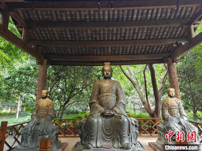 在四川博物院,“長(zhǎng)江之神”戶外常設(shè)展迎來(lái)大批觀眾?,F(xiàn)場(chǎng)立有明代江瀆神青銅像,鑄造工藝精美,青銅像身上的銘文記載了鑄造起因和有關(guān)江瀆祠建造的記錄。