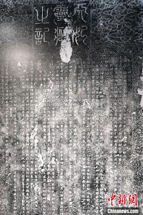 《天妃靈應(yīng)之記》碑高162厘米、寬78厘米、厚16厘米。碑以黑色頁巖為料,碑額正中篆書“天妃靈應(yīng)之記”,周邊飾以祥云捧月(日)圖案,兩旁陰刻如意云水紋,碑體邊框飾一周纏枝花卉紋。碑文楷書直下計(jì)31行,全文1177字,除其中有若干字磨損外,碑文清晰,至今基本完整可讀。