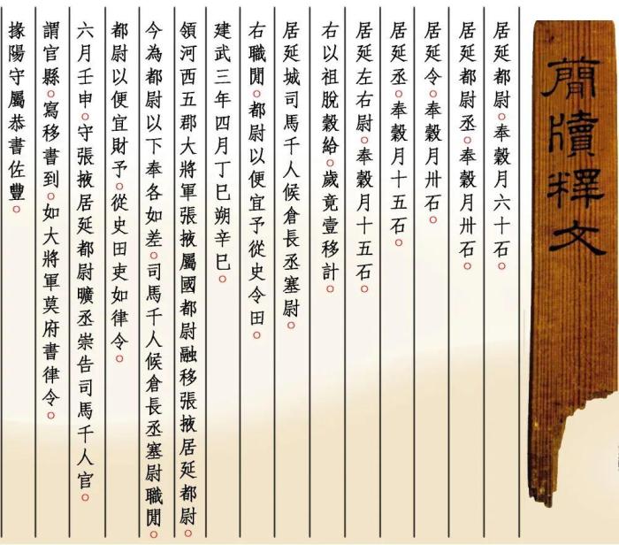 “建武三年四月丁巳朔辛巳,領(lǐng)河西五郡大將軍張掖屬國(guó)都尉融移張掖居延都尉,今為都尉以下奉各如差,司馬千人候倉(cāng)長(zhǎng)丞塞尉職閑,都尉以便宜財(cái)予,從史田吏如律令……”出土于內(nèi)蒙古額濟(jì)納旗甲渠候官遺址的《建武三年居延都尉吏奉例》由10枚簡(jiǎn)組成,每簡(jiǎn)長(zhǎng)22.8厘米,前兩簡(jiǎn)寬2.5厘米、其余8簡(jiǎn)寬1.4厘米,全文200字。
