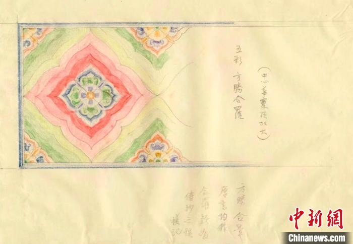 5月27日,“彩畫千年——中國官式彩畫傳承與創(chuàng)新展”在故宮博物院永壽宮展廳正式對公眾開放。圖為梁思成手繪的宋代五彩方勝合羅(復制品)。(故宮博物院供圖)