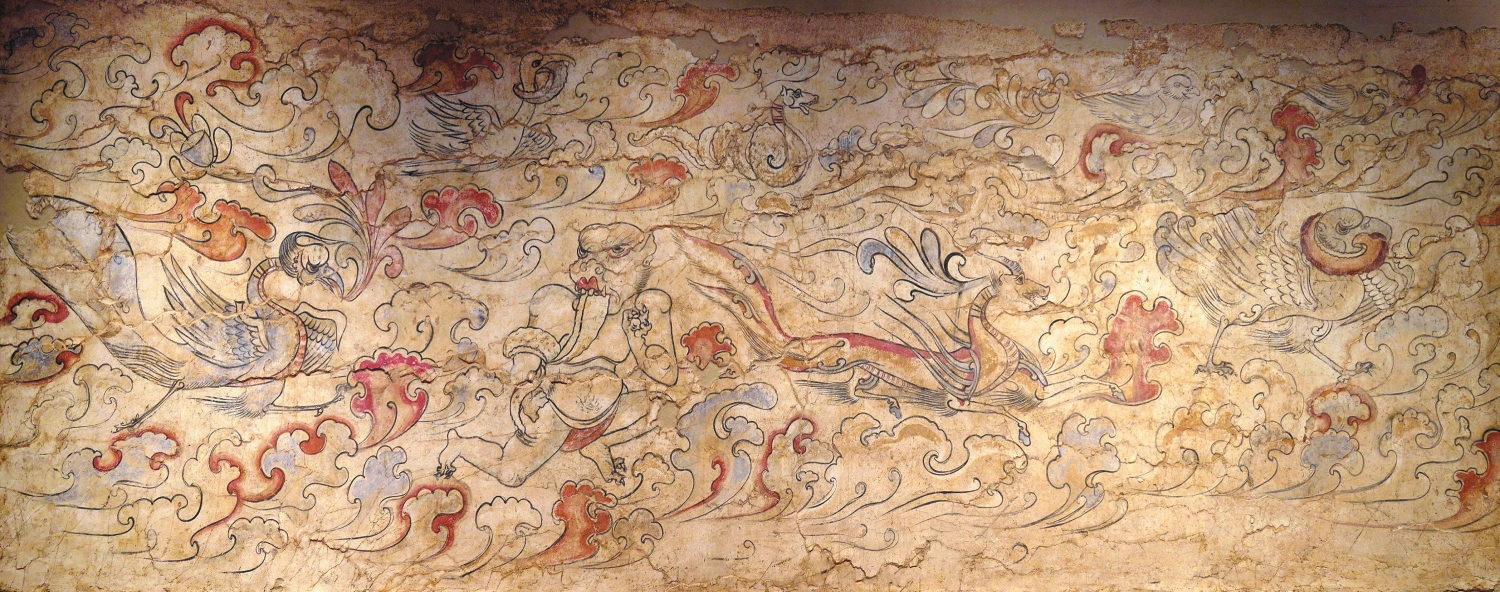 忻州北朝墓墓道東西兩壁的壁畫非常令人震撼,是同時(shí)期墓葬壁畫中保存較完整、精細(xì)的一處,對(duì)研究北朝社會(huì)生活、繪畫藝術(shù)、古代建筑史都有非常重要的意義。壁畫第一層為升天景象,繪有神怪異獸、龍鶴仙人、風(fēng)伯雨師等形象;第二層以郁郁蔥蔥的山林為背景,描繪了備馬出行和狩獵場(chǎng)景;第三、四層依舊以山林為背景,繪有隊(duì)列出行圖。此外,墓道北壁還繪有一座規(guī)模宏大的廡殿頂木結(jié)構(gòu)建筑。墓室壁畫雖遭破壞,但分層圖像依稀可見(jiàn),布局基本清楚。第一層為星象圖,東壁上方還殘存三足烏的形象;第二層為四神圖,形體巨大;第三層為牛車鞍馬圖,其中東壁為牛車,西壁為鞍馬,華蓋羽傘,隨行人物依稀可辨。