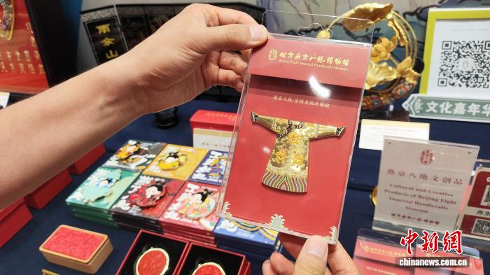 北京燕京八絕博物館依照館藏文物“京繡龍袍”設(shè)計的冰箱貼。(《中國新聞》報 任德輝 攝)