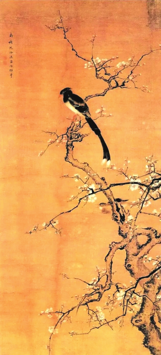 宋代畫家筆下的梅花大都與禽鳥(niǎo)有所關(guān)聯(lián),這主要得益于花鳥(niǎo)畫在此時(shí)的繁盛之勢(shì)。宋徽宗趙佶的《臘梅山禽圖》就把梅花與白頭翁聯(lián)系起來(lái),描繪了在乍暖還寒的季節(jié)里,兩只相伴而生的白頭翁立于臘梅枝頭的場(chǎng)景,給觀者帶來(lái)復(fù)蘇之感。作品左下角題詩(shī)“山禽矜逸態(tài),梅粉弄輕柔。已有丹青約,千秋指白頭”,表達(dá)了愛(ài)情之思。因?yàn)榘最^翁在傳統(tǒng)文化中象征吉祥與幸福,是對(duì)白頭偕老的隱喻,當(dāng)它與梅花結(jié)合起來(lái)時(shí),便會(huì)強(qiáng)化人們對(duì)美好愛(ài)情的聯(lián)想。