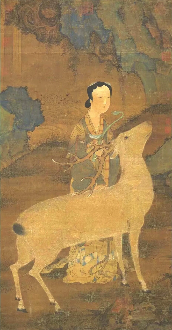 在傳統(tǒng)文化中,鹿是一種有神力的動物,神話傳說中鹿往往是神仙的坐騎。李白一生尋仙問道,其《夢游天姥吟留別》中有“且放白鹿青崖間,須行即騎訪名山”之名句。南極仙翁的白鹿,不僅被繪制在壽畫里,在文學中也大放異彩?!段饔斡洝分械陌茁咕褪菈坌悄蠘O仙翁的坐騎,偷得壽星的蟠龍拐杖后下凡為妖。在《白蛇傳》里,白娘子獨闖昆侖山,欲盜取起死回生的靈芝仙草,遭遇鶴、鹿二仙童阻攔。清代神魔小說《女仙外史》中的鹿童化為道人,下凡后為禍人間。屢破票房紀錄的動畫電影《哪吒2》,其中的反派之一鹿童,是無量仙翁的大弟子,擔任捕妖隊頭領,戲份頗重。