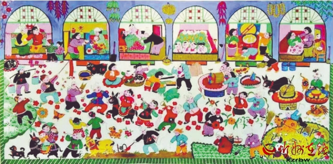 炕圍畫又稱“墻圍畫”,是一種中國民間常見的室內(nèi)裝飾畫。忻州處于高寒地帶,在農(nóng)村家家戶戶都用火炕取暖御寒,炕上的墻面極易脫落起皮,蹭臟衣物被褥。于是人們以刷墻所用的白土調(diào)以膠水,在環(huán)炕的墻上涂高約二尺的“圍子”,既保護了墻面,又使人們免遭臟衣污物之累。后來,炕圍畫逐漸發(fā)展為以顏料做底、色彩畫花、桐油涂罩,既鮮艷明亮,又堅固耐久。日常臟污了,用濕布擦拭,則又光亮如新。