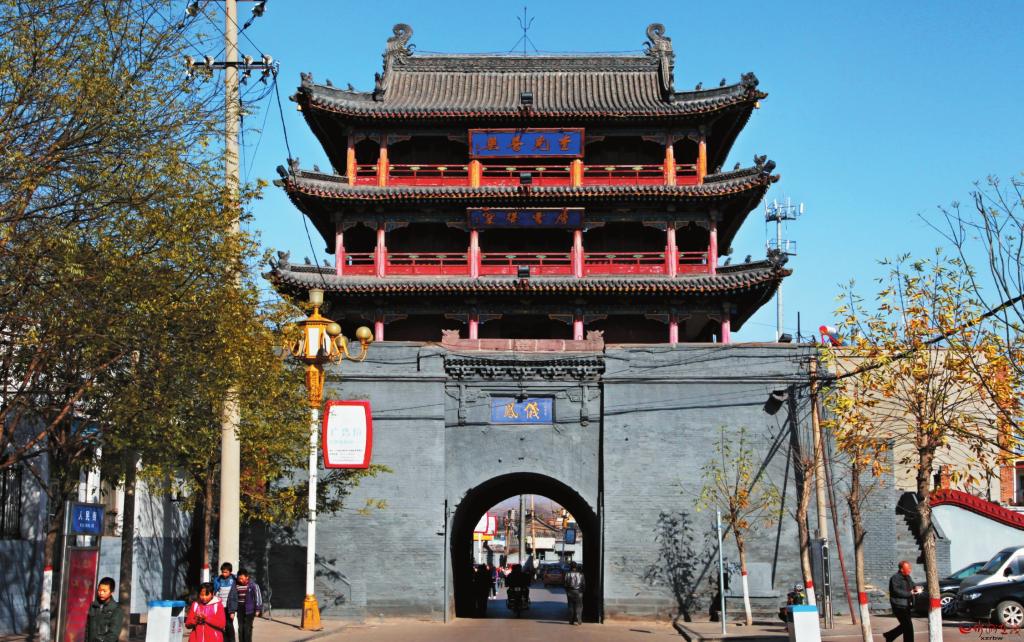 地處府城中心的鼓樓,是府城的最高建筑。明成化年間(1465年——1487年)建成,清光緒十七年(1891年)重修。鼓樓通高20米,磚石結構臺基,上有三層建筑。鼓樓的奇特之處是底層磚碹洞是十字洞,東西南北四面皆通。東西兩個洞使七百戶街保持直通,成為寧武府城最長最寬的街。南北兩洞延伸,將頭百戶、三百戶、五百戶、九百戶幾條街連成一片,既便于排水,又方便出行。西門刻“鳳儀”,東門刻“含陽”,下題“光緒辛卯圜郡重建”。磚洞以上是三層木結構建筑,面寬五間,進深四椽,四周圍廊,檐柱間設雀替。三重檐歇山頂,一重檐下東西設隔扇門,其余為墻體。二、三重檐下東西面懸匾,東為“樓煩重鎮(zhèn)”“毓秀鐘靈”,西為“奎光普照”“層霄聳翠”。鼓樓為省級文物保護單位。