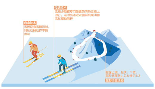 越野滑雪技術(shù)分為傳統(tǒng)技術(shù)和自由技術(shù)。傳統(tǒng)式滑行是在專門設(shè)置的兩條雪槽上進(jìn)行,運(yùn)動(dòng)員通過雙腿前后擺動(dòng)和雪杖撐動(dòng)前行。自由式滑行則沒有雪槽和動(dòng)作的限制。