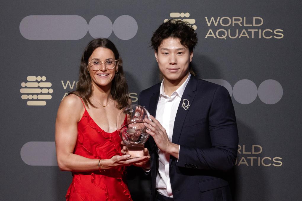 10月23日,在匈牙利布達(dá)佩斯,中國選手覃海洋獲選世界泳聯(lián)年度最佳男子游泳運(yùn)動(dòng)員,澳大利亞選手麥基翁獲選最佳女子游泳運(yùn)動(dòng)員。新華社發(fā)(弗爾季·奧蒂洛攝)