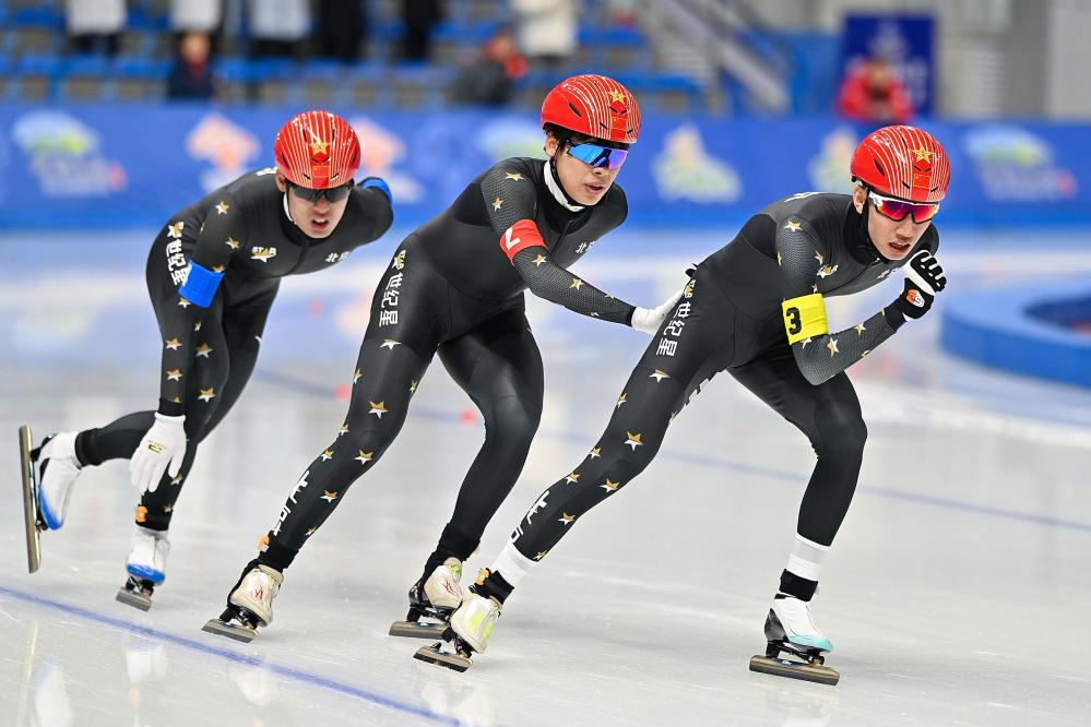 男子團(tuán)體追逐決賽是速滑青年組的最后一場比賽,北京隊(duì)以3分52秒69的成績摘得金牌,并打破該項(xiàng)目全國青年紀(jì)錄。