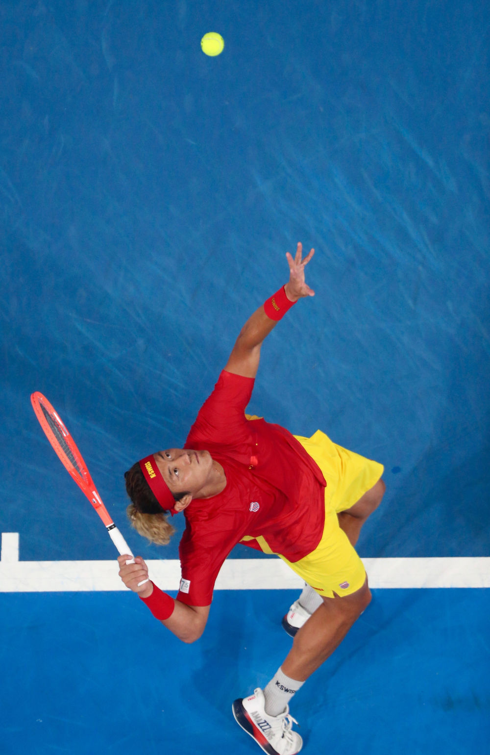 1月1日,中國隊選手張之臻在男單比賽中發(fā)球。新華社發(fā)(周丹攝)