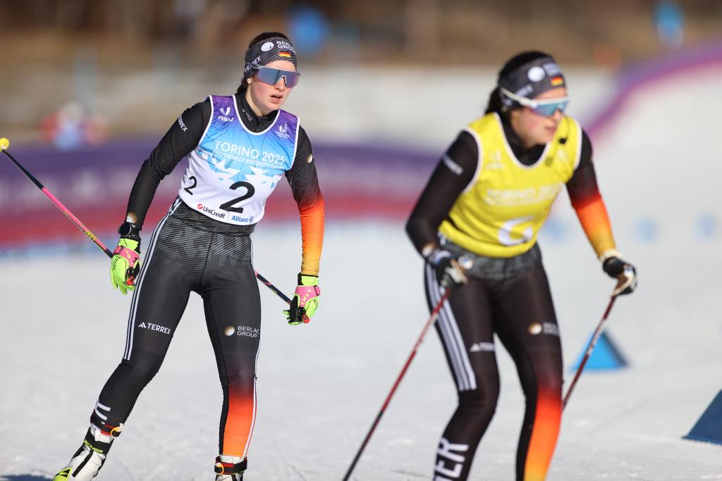 1月15日,德國(guó)選手約翰娜·雷克滕瓦爾德(左)和她的領(lǐng)滑員克里斯蒂安·克拉斯曼在2025年都靈大冬會(huì)越野滑雪女子10公里視障NS級(jí)比賽中。新華社記者 李京 攝