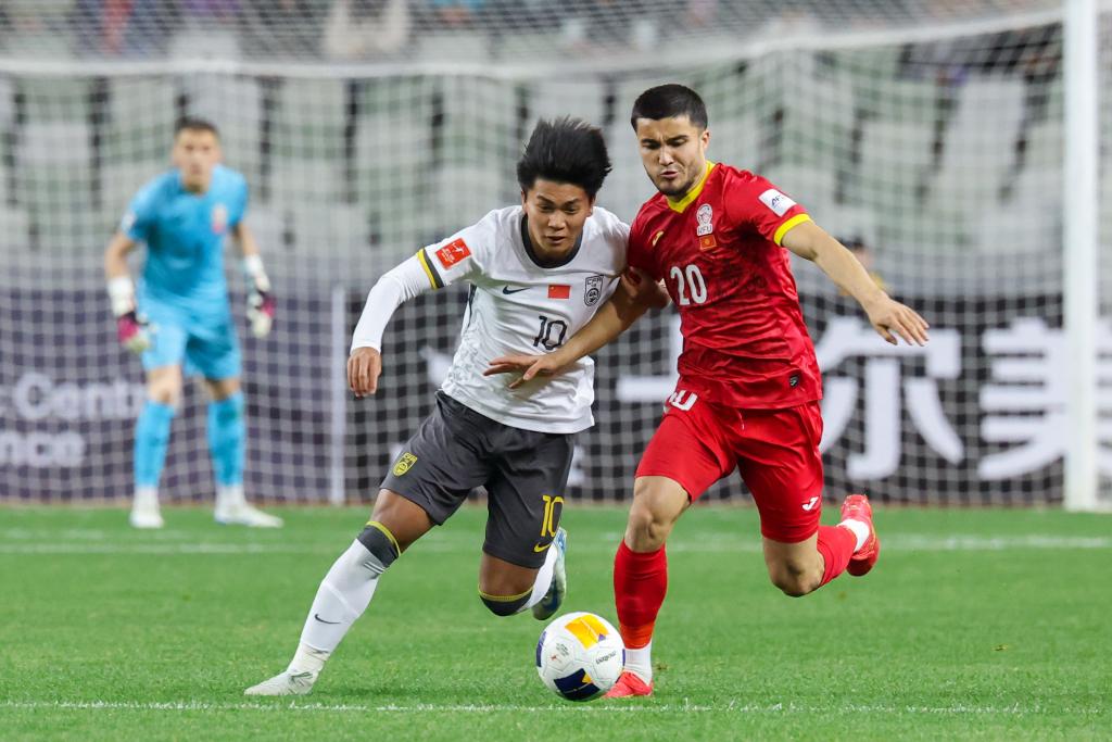 在2月15日進(jìn)行的2025亞足聯(lián)U20亞洲杯小組賽中國隊(duì)對陣吉爾吉斯斯坦隊(duì)比賽中,蒯紀(jì)聞(左)與對手拼搶。新華社記者梁旭攝