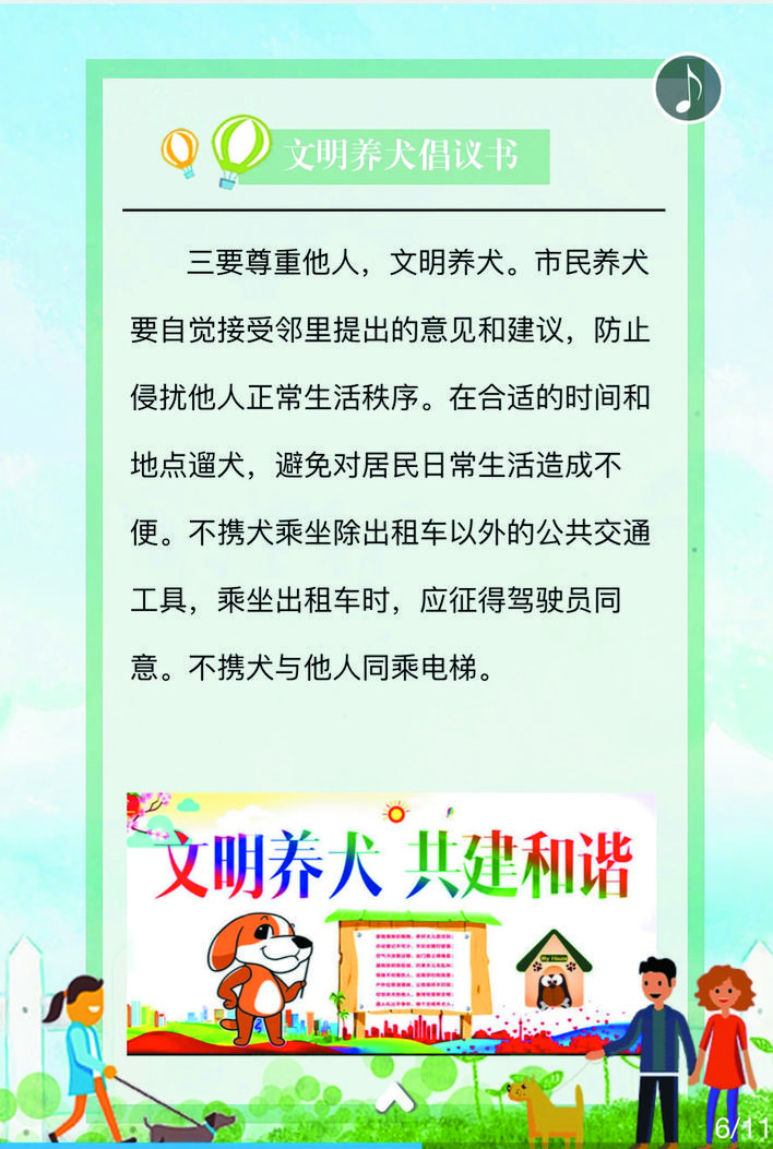 《文明養(yǎng)犬公告》包含十一項主要內(nèi)容,具體是:一、養(yǎng)犬人應(yīng)當(dāng)遵守有關(guān)法律、法規(guī),尊重社會公德,維護公共秩序,不得損害社會公共利益和他人的合法權(quán)益;二、養(yǎng)犬管理按照重點管理區(qū)和一般管理區(qū)實行分區(qū)管理。忻府轄區(qū)外環(huán)線范圍以內(nèi)為養(yǎng)犬重點管理區(qū)。其他區(qū)域為養(yǎng)犬一般管理區(qū);三、養(yǎng)犬實行狂犬病免疫制度。犬只出生滿三個月或者免疫期滿的,養(yǎng)犬人應(yīng)當(dāng)攜犬只到獸醫(yī)主管部門公布的犬只免疫網(wǎng)點接種狂犬疫苗;四、在重點管理區(qū)內(nèi)養(yǎng)犬實行責(zé)任書制度。村(居)民委員會或者社區(qū)物業(yè)管理機構(gòu)應(yīng)當(dāng)與養(yǎng)犬人簽訂養(yǎng)犬責(zé)任書,明確有關(guān)文明養(yǎng)犬的責(zé)任事項;五、在重點管理區(qū)內(nèi)養(yǎng)犬實行登記制度。養(yǎng)犬人應(yīng)當(dāng)自取得免疫證明之日起三十日內(nèi),到居住地公安派出所辦理養(yǎng)犬登記;六、在重點管理區(qū)內(nèi),禁止飼養(yǎng)、繁殖和經(jīng)營禁養(yǎng)名錄內(nèi)的烈性犬和大型犬(導(dǎo)盲犬除外);禁止開辦犬類養(yǎng)殖場;七、在重點管理區(qū)內(nèi)攜帶犬只出戶,應(yīng)當(dāng)遵守下列規(guī)定:(一)為犬只佩帶犬牌、束牽引帶,牽引帶長度不得超過兩米,在擁擠場合自覺收短牽引帶。(二)具有完全民事行為能力的人牽引。(三)主動避讓老年人、殘疾人、孕婦和兒童。(四)乘坐電梯,應(yīng)當(dāng)避開高峰期,征得電梯內(nèi)其他人的同意,佩戴嘴套或裝入犬籠、犬袋,并主動避讓他人。(五)及時清除犬只排泄的糞便。(六)不得攜犬進入設(shè)有犬類禁入標(biāo)志的公園、廣場等公共場所。(七)不得攜犬乘坐大型公共交通工具,攜犬乘坐出租汽車時,須征得司機同意。(八)養(yǎng)犬不得干擾他人正常生活,不得放任、驅(qū)使犬只恐嚇、攻擊他人,影響他人休息的,養(yǎng)犬人應(yīng)當(dāng)采取措施予以制止;八、凡流浪犬或無人牽領(lǐng)的犬只,視為無主犬只予以收容;九、市民養(yǎng)犬應(yīng)當(dāng)按規(guī)定對所養(yǎng)犬只注射狂犬疫苗、定期檢疫。犬只出現(xiàn)狂犬癥狀的,養(yǎng)犬人應(yīng)當(dāng)及時采取捕滅措施,并向農(nóng)業(yè)部門報告,危害公共安全的,應(yīng)及時報告公安部門;十、違反有關(guān)規(guī)定將依據(jù)《忻州市養(yǎng)犬管理條例》、《中華人民共和國治安管理處罰法》等法律進行處罰;十一、廣大市民應(yīng)積極抵制不文明養(yǎng)犬行為。對違反本通告規(guī)定的養(yǎng)犬行為,任何單位和個人都有權(quán)批評、勸阻,或者舉報。