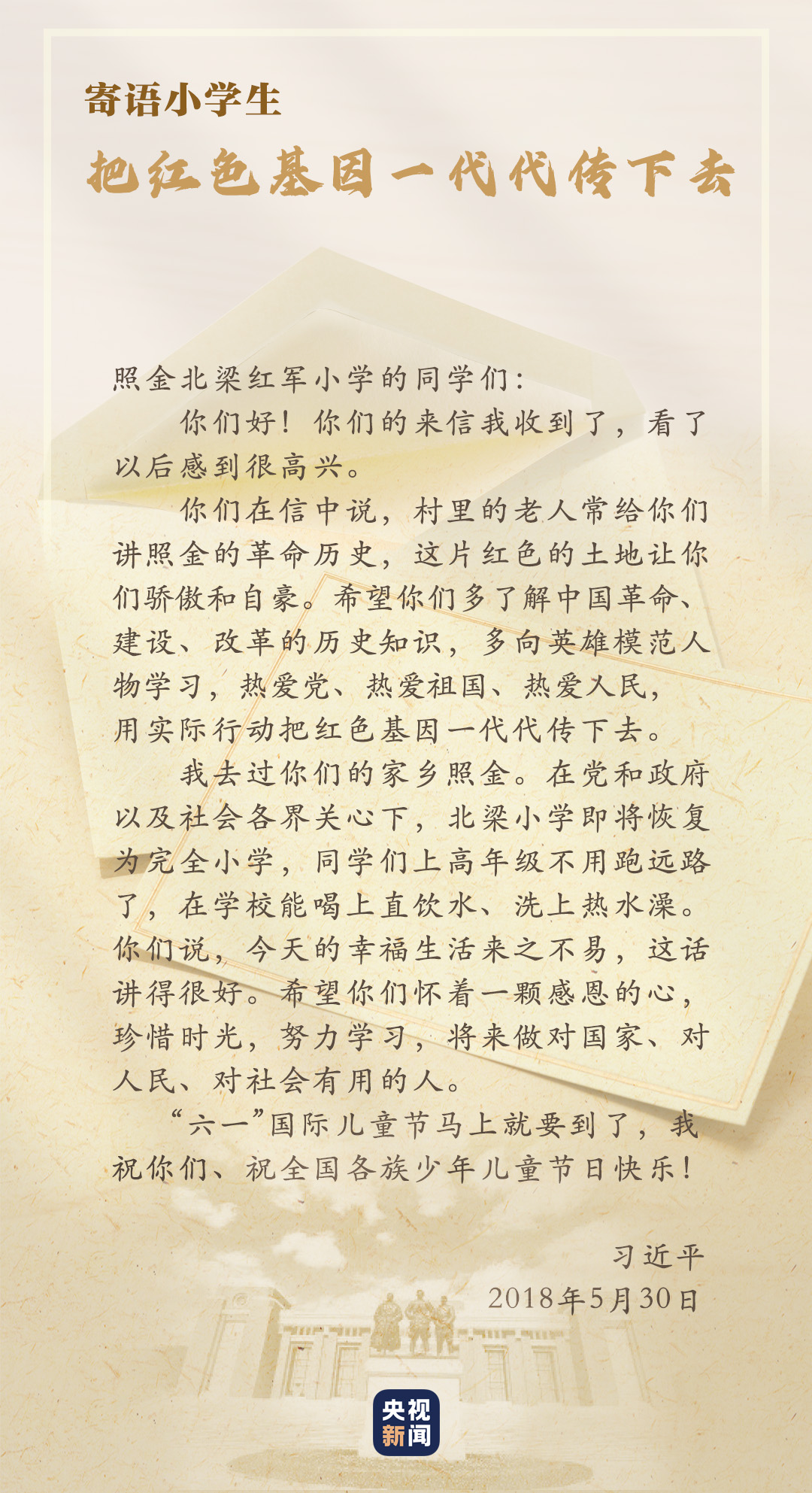 校舍變新了,師資變強(qiáng)了,不變的是代代相傳的紅色基因。總書(shū)記的回信,激勵(lì)著這里的孩子傳承紅色基因,回報(bào)社會(huì),用光熱溫暖更多人,把愛(ài)傳遞出去。