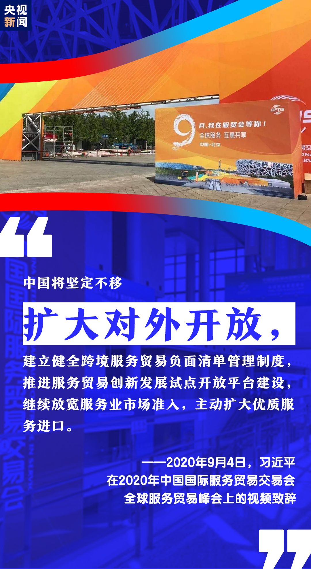 習(xí)近平表示,中國將堅(jiān)定不移擴(kuò)大對外開放,繼續(xù)放寬服務(wù)業(yè)市場準(zhǔn)入,發(fā)展服務(wù)貿(mào)易新業(yè)態(tài)新模式,支持組建全球服務(wù)貿(mào)易聯(lián)盟,支持北京打造國家服務(wù)業(yè)擴(kuò)大開放綜合示范區(qū),帶動(dòng)形成更高層次改革開放新格局。