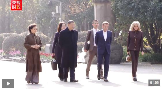 初冬的都江堰,蒼山掩翠。馬克龍夫婦抵達時,受到習近平和彭麗媛熱情迎接。兩國元首夫婦沿堰功道邊走邊談。習近平介紹都江堰歷史和意義,指出都江堰水利工程是全世界迄今唯一仍在使用的古代水利工程,也是人類與自然和諧共生最早的成功實踐之一,修建過程充分反映了中華民族自強不息、不畏艱難、勇于開拓的精神。兩國元首夫婦落座懷古亭,臨水品茗,縱論天下。