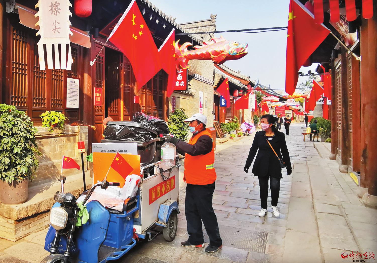10月14日,忻州古城的環(huán)衛(wèi)工人正在上門收運(yùn)沿街商戶產(chǎn)生的垃圾,保證日產(chǎn)日清,垃圾不落地。(張存良 攝)
