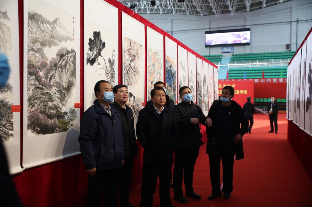活動現(xiàn)場,專業(yè)人員為縣領導講解美術類參展作品的詳細內(nèi)容。