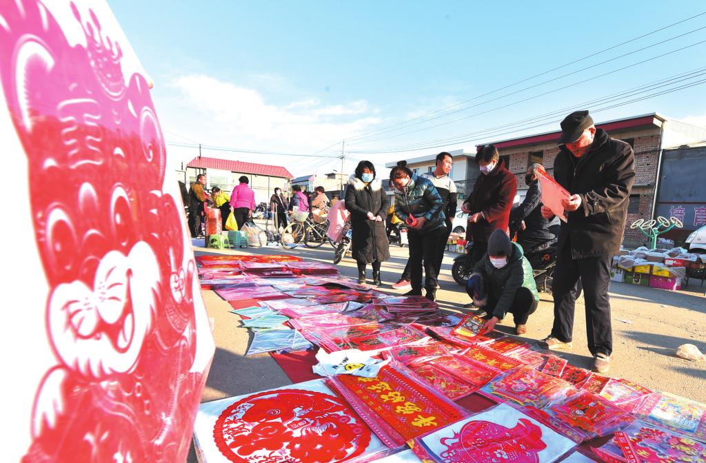1月18日,在忻府區(qū)東樓鄉(xiāng)南肖村廣場(chǎng)上,幾位村民在集市上挑選春聯(lián)、購(gòu)買(mǎi)年貨,迎接新春佳節(jié)的到來(lái)。 (馮曉磊攝)
